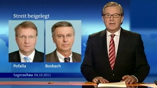 „Kanzleramtsminister Pofalla und der Unions-Innenpolitiker Bosbach haben Ihren Streit endgültig beigelegt. Pofalla entschuldigte sich in der Bild-Zeitung für einen verbalen Ausfall. Er hatte Bosbach beschimpft, nachdem dieser angekündigt hatte, er werde in Zukunft seine Haare ebenfalls rechtsbündig scheiteln. Bosbach erklärte, für Ihn sei die Angelegenheit erledigt.“